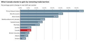 Canada’s economy could gain nearly 7%, or $210 billion, in real GDP over a gradual period by fully removing internal trade barriers between the country’s 13 provinces and territories, according to a report published Tuesday by the International Monetary Fund (IMF). On average, regulation-related barriers are the equivalent of a 9% tariff nationally, estimates the report, which was co-authored by IMF researchers Federico J. Diez and Yuanchen Yang with contributions from University of Calgary economist Trevor Tombe. …Because of the trade barriers between provinces, “Canada isn’t really one economy. It’s really 10 economies,” said Alicia Planincic, director of policy and economics at the Business Council of Alberta in Calgary. …The report points to finance, telecom, transportation and professional services as far-reaching sectors that “ripple through the economy” and raise costs for all of the businesses they touch.