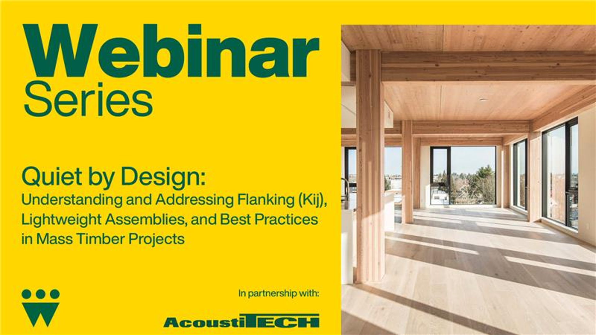 Join the Canadian Wood Council for Quiet by Design, an in-depth webinar exploring how to achieve consistent, high-performing acoustics in mass timber projects. In partnership with AcoustiTECH, a panel of leading acoustic experts will unpack the complexities of flanking (Kij), share best-practice detailing strategies—including bulkheads and wall interfaces—to help you avoid costly construction errors, and present the latest research on lightweight floor and ceiling assemblies for mass timber systems, including GLT. Expect practical design strategies, real-world insights, and clear, actionable guidance to help you choose the right acoustic solutions for your next project. Date: Tue, Nov 25, 2025